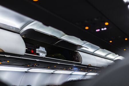 luggage on the top shelf on airplane