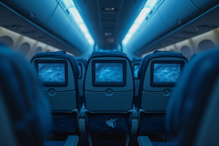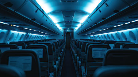 Modern airplane interior with ambient blue lighting on seats and ceiling for comfortable travel experience