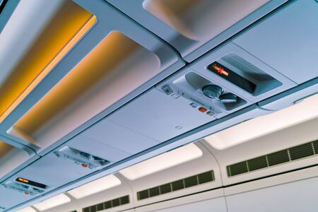 Interior of the airplane with empty seats and lights. Airplane interior