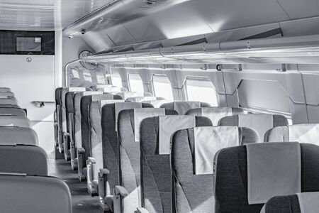 Inside the passenger plane inside the cabin in black and white