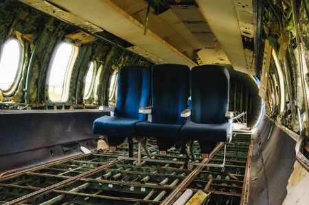 Inside of old abandoned passenger airplane. Plane wreck.