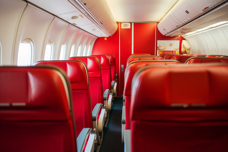 Bright and inviting airplane cabin features rows of red seats, all set for a new journey. Large windows allow natural light to brighten the space, enhancing the travel experience.