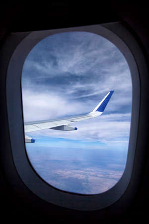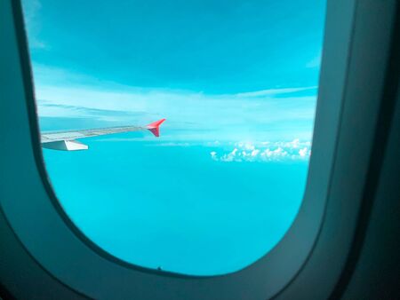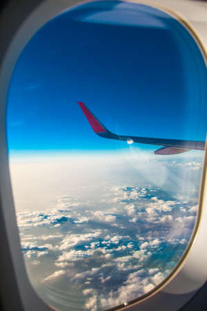 View from the porthole of the airplane window with blue sky and clouds
