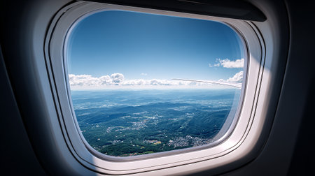 A captivating perspective of soft white clouds floating in the vast expansion of the sky as seen from an airplane window, evoking a sense of tranquility, wanderlust, and admiration for nature's