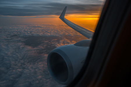Flying and traveling, view from airplane window on the wing on cloudy sunset afternoon