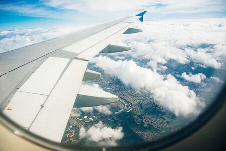 Plane window view of clouds and islands surrounded by sea and airplane wing. Traveling concept.
