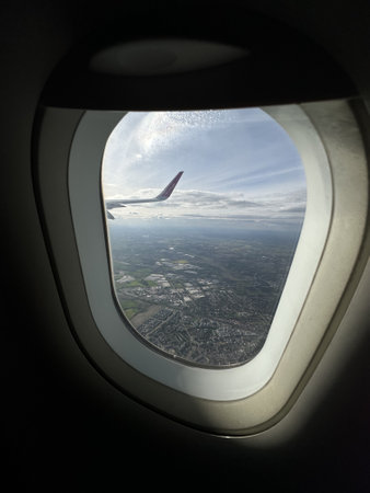 View from the airplane window on the city from the porthole