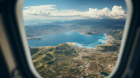 Beautiful island with blue ocean through plane window with visible wing in evening with gorgeous sunset.AI Generative.