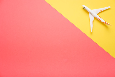 Travel minimal background banner. Model airplane in flight on an empty colored background. Copy space