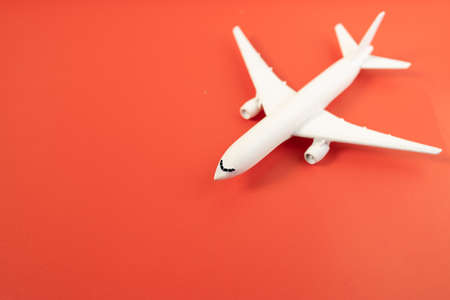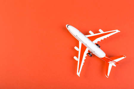 toy Model of a modern airplane with red wings. tourism and travel concept. orange background