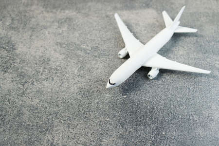 Top view of a white model airplane takes off from the runway with a copyspace. Travel and vacation concept