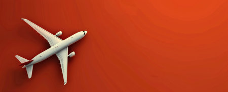 A commercial airplane soaring through the sky against a vibrant red background.