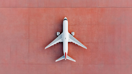 Top down aerial view of a white passenger airplane parked on a red tarmac, representing concepts of travel, business, and the aviation industry