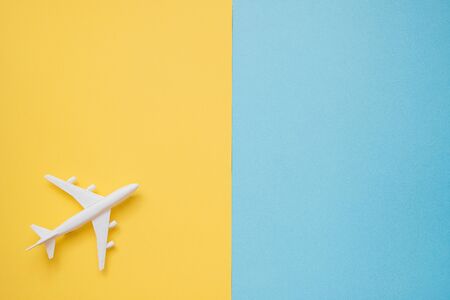 Summer holiday travel and vacation concept. Air plane on pastel blue and yellow background with copy space for text. Flat lay design.