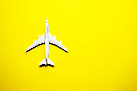 Miniature toy airplane on yellow background. Trip by airplane