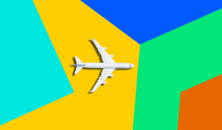 Miniature toy airplane on colorful paper background. Flat lay design of travel concept with plane on blue sky with copy space.