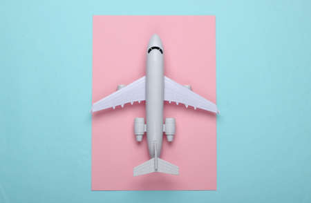Air flights and travel. Blue toy airplane on light blue and pink matching color background. Flat lay with copy space for air travel planning or ticket fare or booking concept banner