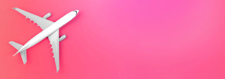 Airplane on a pink background, flat lay, travel concept.