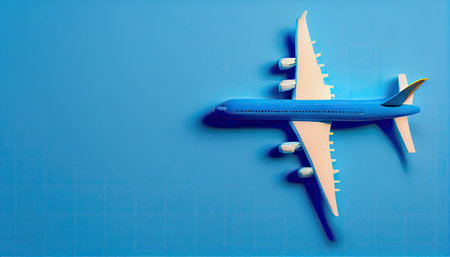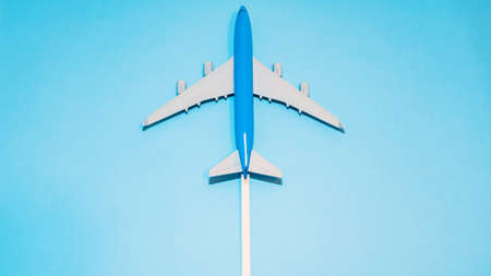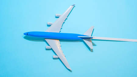 Model plane,airplane on blue pastel color background with copy space.Flat lay design.Travel concept on blue background. top view