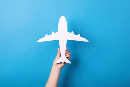 hand holding white airplane over blue background, travel concept