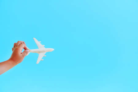 A white airplane in a childs hand against a blue sky. The concept of a dream of travel and flights.