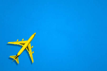 Miniature of a blue plane on a yellow background. Horizontal photo, flat lay. Space for text, copy space. Concept - air travel, ticket booking