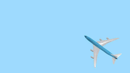 Blue passenger plane top view. Copy space model of an airplane in flight.