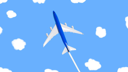 Blue passenger plane top view. Copy space model of an airplane in flight with a contrail white trail.