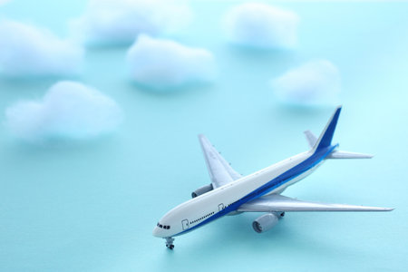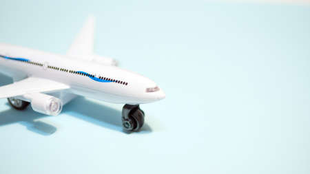 Model plane, airplane on blue pastel color background. Flat lay of miniature toy airplane. minimal trip and travel creative concepts. copy space
