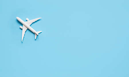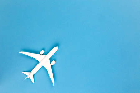 White airplane on blue background with copy space for text. Minimal travel concept. Flat lay style composition for travel agency or airline