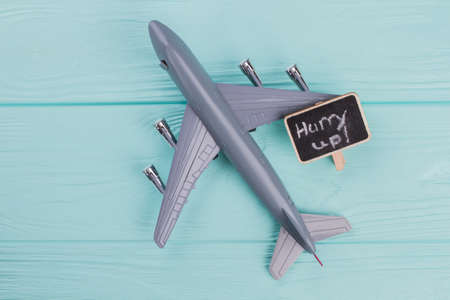 Little grey plastic plane and little nameplate on blue background with copy space. Wooden textured background.