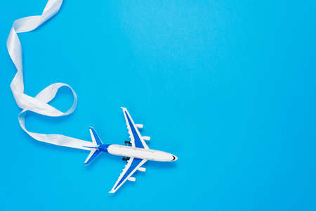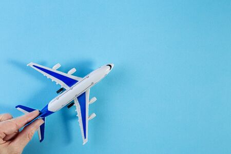 Flat lay design of travel concept with plane on blue background with copy space. The concept of flight, tourism and goal setting, leadership, prospects.