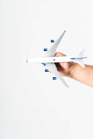 A man’s hand holding a miniature aeroplane against white background