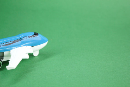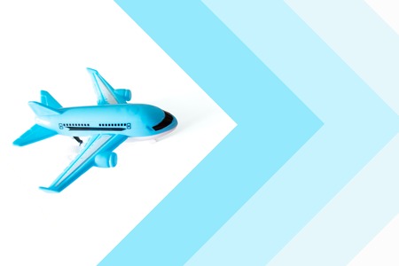 Blue toy airplane on white and blue background with copy space, travel, journey and flying concept.