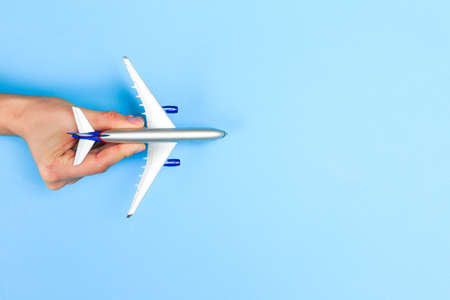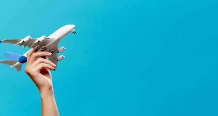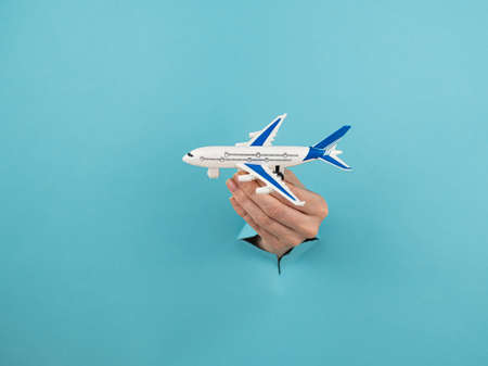 A female hand sticking out of a hole from a blue background holds a model of an airplane.