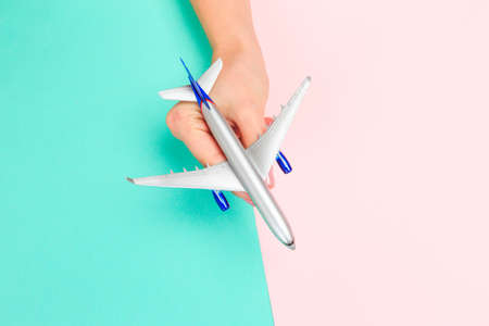 Air flights and travel. Blue toy airplane on light blue and pink matching color background. Flat lay with copy space for air travel planning or ticket fare or booking concept banner