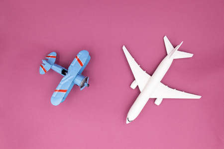 Military fighter and passenger plane on a blue pink background. Toy Models