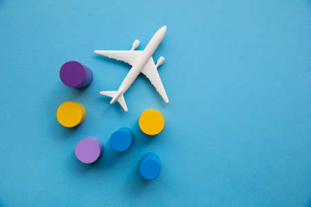 Travel background with a toy airplane and colourful circular blocks
