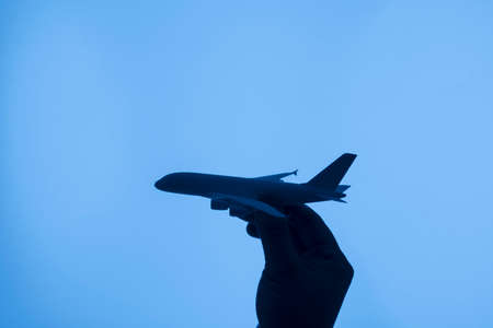 Silhouette of a hand holding an airplane model.