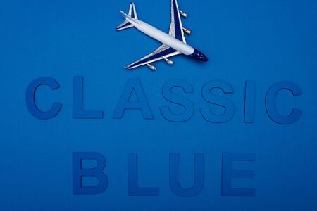 Toy plane on classic blue background with top view and copy space. Travel concept.