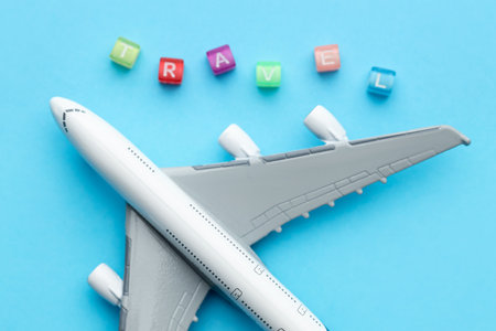 Travel concept. Plane model and colorful cubes on light blue background, top view