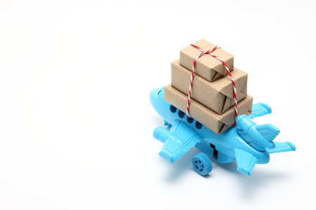 Parcel box on toy airplane in white background with copy space. Air cargo and parcels transportation concept. Fast delivery of goods and products.