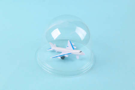 Air plane under transparent dome on blue background. Protection, travel isolation concept. minimal layout
