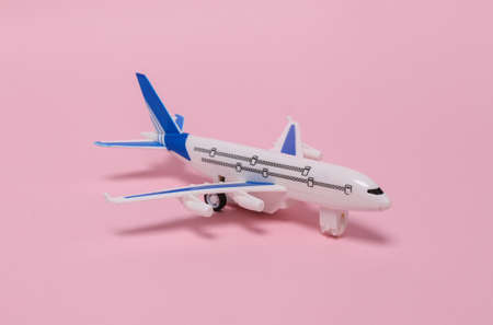 Travel, tourism or voyage concept. Model of a passenger plane on pink background