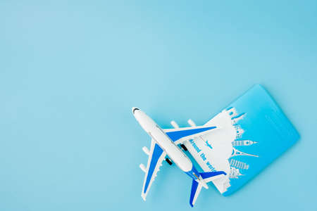 Passport and airplane on light blue background.Summer or vacation concept. Copy space