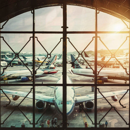 image of an airport as seen from the terminal with service vehicles and some aircraft on the runway at sunset, sun setting behind the cargo terminal buildings, fingers at the foreground, vertical