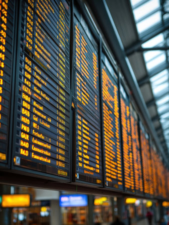 Travelers consult the flight information board displaying real-time arrival and departure schedules in a busy airport terminal during midday.