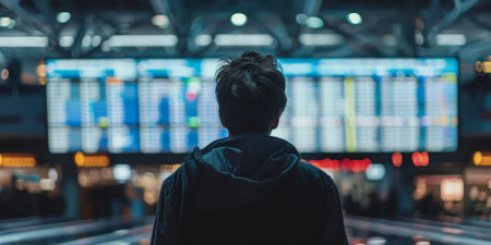 A lone traveler gazes intently at the airport's departure board, anticipating their upcoming journey.