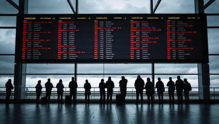 Group of travelers standing in front of a large digital departure board in a modern airport terminal. Outside the window, a plane is visible on the tarmac under a gloomy, overcast sky. The display shows numerous flight delays and cancellations, creating a tense and uncertain travel atmosphere.