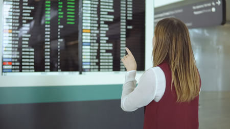Beautiful girl stands and choice flight on the background of blurry scoreboard with the notice.